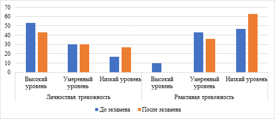 По результатам онлайн-тестирования по методике Спилбергера-Ханина до экзамена высокий уровень личностной тревожности (ЛТ) наблюдался у 16 студентов (53 %), умеренный – у 9 (30 %), низкий – у 5 (17 %). После экзамена картина изменилась: высокий уровень ЛТ зафиксирован у 13 участников (43 %), умеренный остался на прежнем уровне – у 9 студентов (30 %), а доля лиц с низкой ЛТ увеличилась до 8 человек (27 %). Что касается реактивной тревожности (РТ), то до экзамена высокий её уровень отмечался лишь у 3 студентов (10 %), умеренный – у 13 (43 %), а низкий – у 14 (47 %). После сдачи экзамена высокий уровень РТ не выявлен ни у одного участника, умеренный уровень сохранялся у 11 студентов (36 %), тогда как низкий уровень РТ значительно возрос – до 19 человек (63 %). Полученные данные представлены на рисунке 2. Статистический анализ показал статистически значимые различия между показателями до и после экзамена: так, значимо изменились значения как у студентов с изначально высоким уровнем личностной тревожности (p=0,001), так и у тех, у кого он был низким (p=0,002). Кроме того, после экзамена наблюдалось статистически значимое снижение числа студентов с умеренной реактивной тревожностью (p=0,003) и одновременное достоверное увеличение доли лиц с низким уровнем реактивной тревожности (p=0,001).