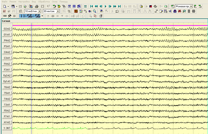 Съем биоэлектрической активности головного мозга проводился там же на кафедре медицинской и биологической физики, в соседнем кабинете (специальной лаборатории) при помощи электроэнцефалографической установки «Энцефалан-131-03» при постоянном времени 0,3 с и фильтре верхних частот 40 Гц при частоте дискретизации 125 Гц (производство ООО НПКФ «Медиком-МТД», г. Таганрог).