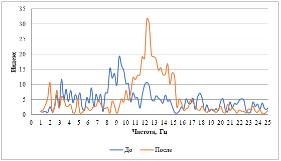 Потом делали построение графиков спектра ЭЭГ до и после экзамена на одной координатной оси (на основе проведенного анализа Фурье). По результатам спектрального анализа были построены графики спектров до и после экзамена (зачета) на одной координатной плоскости. На этих графиках видно, что в областях δ (0,5-4 Гц), θ (4-8 Гц), α (8-13Гц), β (13-24 Гц) имеются видимые изменения. На рисунке 5 представлены спектры биоэлектрической активности головного мозга до и после экзамена.