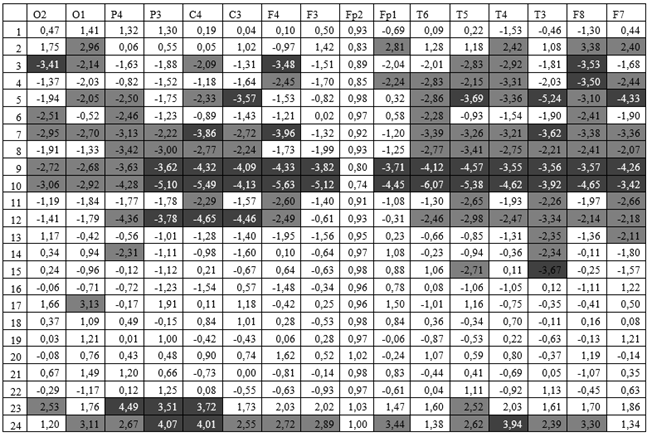Поскольку все исследуемые выборки соответствовали нормальному распределению, для оценки статистически значимых различий был применён t-критерий Стьюдента. Для каждой частоты (в герцах) и каждого отведения рассчитывались значения t-критерий Стьюдента и соответствующие им уровни значимости (p-значения). В Таблице 1 представлены значения t-критерия Стьюдента для сравнения спектральной мощности ЭЭГ до и после экзамена. Серым цветом выделены значения, достигшие уровня статистической значимости p<0,05, а темно-серым цветом выделены значения, достигшие уровня статистической значимости р<0,01. Такая формализация позволяет четко идентифицировать частотные диапазоны и корковые отведения, наиболее чувствительные к воздействию острого психоэмоционального стресса, и отделять статистически значимые сдвиги биоэлектрической активности от случайных колебаний фона.