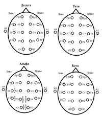 Рисунок 6. Паттерны биоэлектрической активности головного мозга по отведениям и ритмам