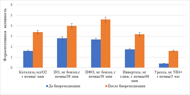 In this work, the activity of soil enzymes and the number of some groups of microorganisms (bacteria, fungi, actinomycetes) before and after microbial bioremediation of soils chronically contaminated with pesticides were studied. It was revealed that before bioremediation, catalase, peroxidase, polyphenoloxidase and urease activities were 1.6 ml O2 g soil min; 2.8 mg benzoquinone g soil 30 min; 2.6 mg benzoquinone g soil 30 min and 0.4 mg NH4+ g soil 3 h, respectively. At the same time, these indicators increased by 2.1; 1.4; 1.7 and 4 times after bioremediation procedures. Microbiological analysis of the number of some groups of microorganisms before bioremediation showed that the maximum CFU of bacteria and actinomycetes is 15.2 × 104 CFU/g of soil and 6.3 × 104 CFU/g of soil. And after bioremediation, the number of these groups of microorganisms increases by an order of magnitude and is 17.6 × 105 CFU/g of soil and 8.4 × 105 CFU/g of soil.