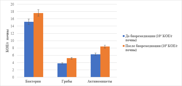 Как известно количественный состав микроорганизмов отражает интенсивность, дозу и характер химического загрязнения. Микробиологический анализ численности некоторых групп микроорганизмов до биоремедиации показал, что максимум КОЕ бактерий и актиномицетов составляет 15,2 × 104 КОЕ/г почвы и 6,3 × 104 КОЕ/г почвы. А после биоремедиации численность этих групп микроорганизмов увеличивается на один порядок и составляет 17,6 × 105 КОЕ/г почвы и 8,4 × 105 КОЕ/г почвы (рис.3). Следовательно, изучение интродукции в хронически загрязненную пестицидами почву биопрепарата на основе эффективных местных штаммов микроорганизмов Bacillus sp. 01, Bacillus cereus 1, Arthrobacter russias, Streptomyces sp. и Streptomyces sp.2. выявило эффективность данного приема ремедиации. Согласно данным микробиологического анализа в исследуемой почве доминировали бактерии рода Bacillus и актиномицеты рода Streptomyces. Сообщество микроскопических грибов в почве было представлено в основном Aspergillus и Mucor.