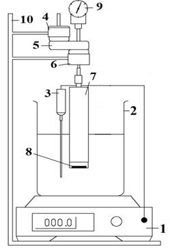 Обозначение: 1 - нагреватель, 2 -реактор, 3 - термометр, 4 - электродвигатель, 5 - шестеренчатый редуктор, 6 - обойма с подшипниками, 7 - фторопласт, 8 - диск, 9 - тахометр, 10 – штатив