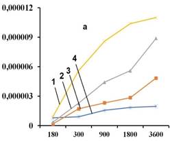 Задачами исследования, в этих условиях, были: построение кинетических зависимостей растворения ВД из МoS2, расчет их параметров и подтверждение диффузионного контроля реакции окисления МoS2, установленного электрохимическим способом [4], сравнение кинетических характеристик чистого МoS2 с аналогичными показателями МoS2 в составе ППМ (рис. 2-4).