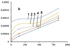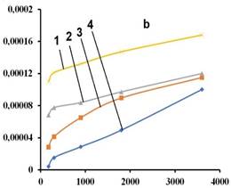 E*aкт находили из зависимости констант скорости процессов от обратной температуры, по уравнению Аррениуса, для значений угловой скорости и времени отбора проб, начиная с момента погружения ВД в электролит, в диапазоне 0-1800 сек.
