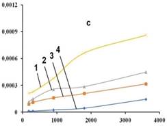 Рисунок 2. Зависимость W(mol·dm–2·s–1) окисления MoS2 (расчет по Мо(VI) в 25% HNO3+5% H2SO4+O2,a, b, с – температура, 0C:24,45,70; ω – угловая скорость вращения: 0-840об/мин, 1) 840; 2) 480; 3) 140; 4) 0