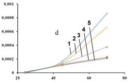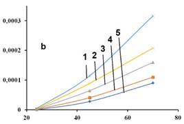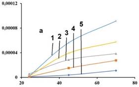 Рисунок 4. Зависимость W(mol·dm–2·s–1) окисления MoS2 (расчет по Мо(VI) от температуры, в растворе состава: 25% HNO3+5% H2SO4+O2,где a, b, с, d - ω, об/мин, соответственно: 0, 140, 480; 840; обозначения 1,2,3,4,5 соответствуют t – времени отбора проб, сек: 1-3600; 2-1800; 3-900; 4-300; 5-180