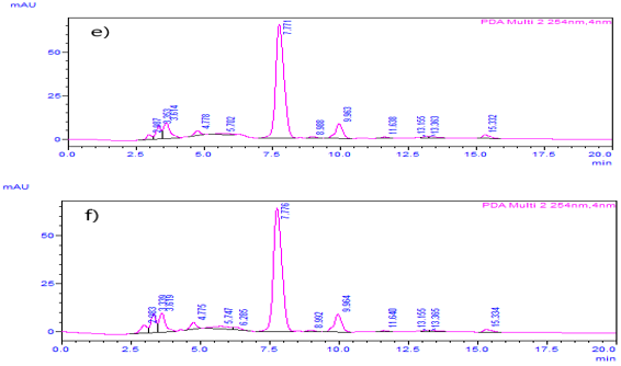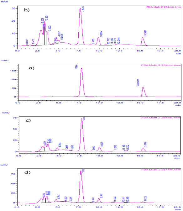 Результаты исследования показывают, что количество рутина и кверцетина в экстрактах цветочных бутонов Sophorajaponica L. в различных растворителях показано на хроматограммах ВЭЖХ, и можно заметить, что количество рутина в этанольных и метанольных экстрактах выше, чем количество кверцетина (рисунок 2).