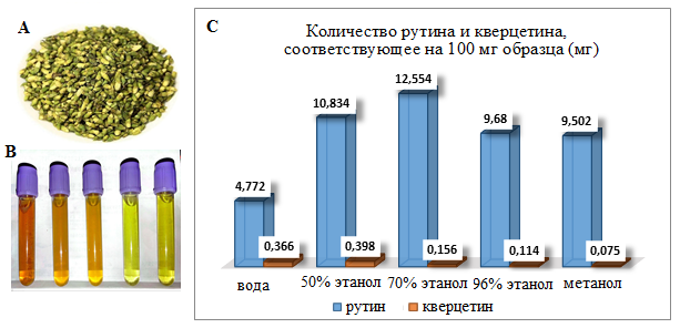 Рисунок 2. А) Цветочные бутоны Sophorajaponica L.; В) водные, 50%, 70%, 96% этанольные, метанольные экстракты; С) Содержание рутина и кверцетина в экстрактах