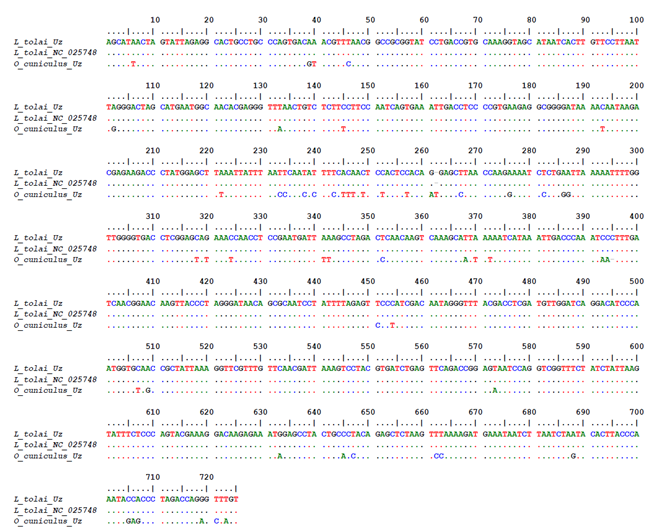 Нуклеотидные последовательности, полученные в результате молекулярно-генетических исследований, были депонированы в Национальной базе данных биоинформатики (NCBI) и получены инвентарные номера. (L. tolai -PV162742,O. cuniculus - PV162744).