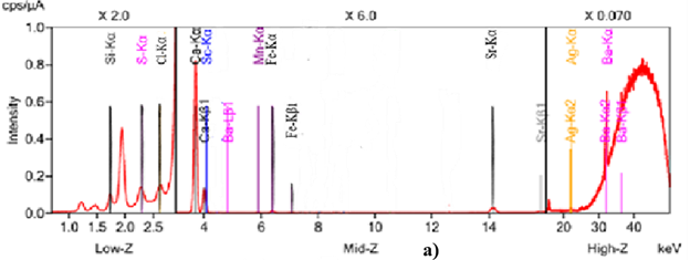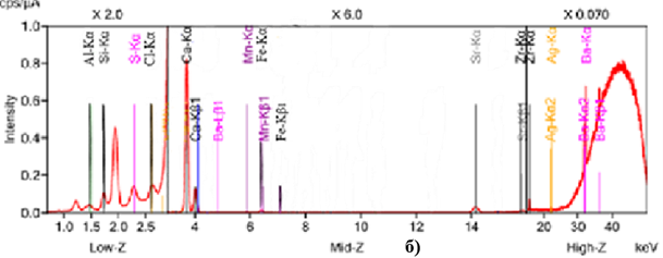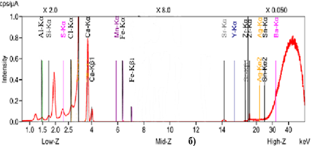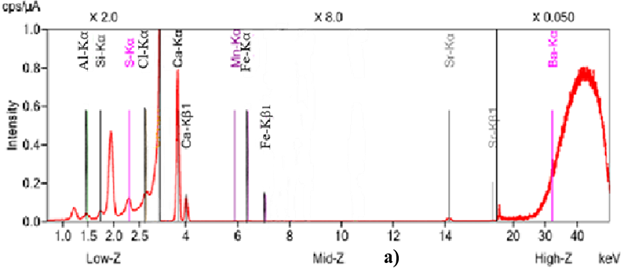 Рисунок 1. Рентген - флуоресцентный спектры сырого известняка а) элементный б) оксидный