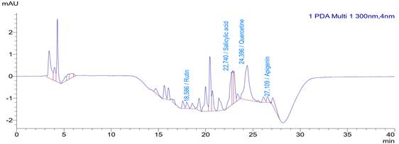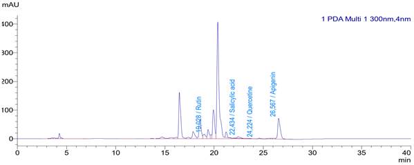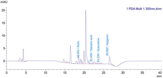 Приготовлен экстракт растения «Calendulae officinalis» (цветки, листья и корень), химический состав экстракта изучен хроматографическим методом. В экстракте обнаружен ряд фенольных соединений, в том числе рутин, салициловая кислота, кверцетин и апигенин, а также биологически активные вещества, такие как витамины: В1, В2, В3, РР, В6, В9, В12 и C. В статье представлен метод высокоэффективной жидкостной хроматографии (ВЭЖХ) для количественного определения фенольных соединений в экстракте растения «Calendulae officinalis» (цветки, листья и корни). По результатам анализа хроматограмм экстрактов установлено, что в стандартных образцах содержатся компоненты рутина, салициловой кислоты, кверцетина и апигенина, соответствующие срокам хранения.