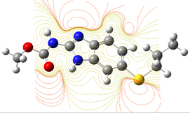 As you can see in the figure, the number one and number three nitrogen atoms in benzimidazole ring have the high negative charges. Their values are -0.345 and -0.306 respectively. There is also the carbonyl’s oxygen atom in carbamate group has the highest negative charge within carbamate group, its value is -0.305. Total electron density image also supports this calculation by showing thick orange-red patterns around these atoms which shows the abundance of electron pairs. This property allows the compound to form coordination compounds with transition metals.