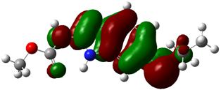 The electron density and electrostatic potential (ESP) maps were generated to visualize regions of high and low electron concentration. These visual representations facilitated identification of nucleophilic sites within the molecule, particularly atoms suitable for coordination with transition metals. Graphical illustrations of the HOMO and LUMO orbitals were prepared to highlight frontier orbital localization. The charge distribution was also visualized. Tabulated data includes total energy, dipole moment, HOMO/LUMO energies, and energy gap values.
