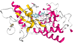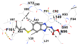 Figure 3. Active binding site of the most stable pose of methyl N-(6-propylsulfanyl-1H-benzimidazol-2-yl) carbamate and its view in VEGFR-2 receptor protein cavity