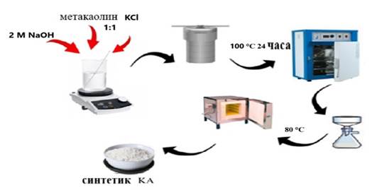 Полученный осадок высушивали в печи при температуре 650 °C с получением метакаолина. Далее метакаолин смешивали с хлоридом калия (KCl) в мольном соотношении 1:1. Полученную смесь перемешивали с 2 M раствором NaOH в течение 24 часов при температуре 60 °C с использованием магнитной мешалки (StableTempColePalmer). После этого смесь переносили в тефлоновый сосуд и выдерживали при температуре 100 °C в течение 28 часов (см. рис.1).Для удаления избыточной щёлочи синтезированный образец промывали дистиллированной водой 3–4 раза до достижения нейтрального значения pH (около 7), после чего высушивали при температуре 80 °C [12].
