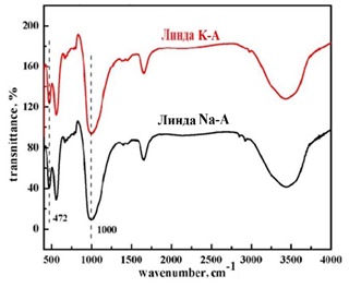 На рис.2 представлен FTIR-спектр цеолита типа LTA. Подобно синтезированному KA, спектр демонстрирует резкий пик высокой интенсивности в области ~1000 см⁻¹, связанный с асимметричным растяжением связи T-O-T (где T = Al или Si). Кроме того, зона колебаний при 472,0 см⁻¹ соответствует вибрациям связи Si–O. Несимметричное растяжение связи T-O-T обладает меньшей интенсивностью по сравнению с основным асимметричным колебанием [8].