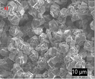Сканирующая электронная микроскопия (SEM). Сканирующее электронное изображение синтезированного цеолита KA (рис.3a) демонстрирует, что кристаллы имеют однородную кубическую форму с незначительными различиями в размерах. На рисунке3b представлено изображение при большом увеличении.