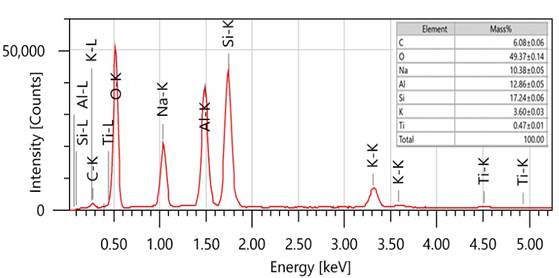 На основании анализа энергодисперсионного анализа был определён следующий элементный состав: O — 49,37%, Na — 10,38%, Al — 12,86%, Si — 17,24%, K — 3,6%, Ti — 0,47%.