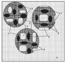 Figure 1. Heterophasic model of polymer gels. 1-ionite matrix, 2-ionite counterions, 3-water in polyelectrolyte solution, 4-electrolyte in polyelectrolyte solution, 5-external solution at equilibrium