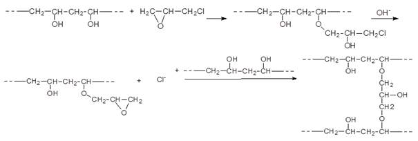 PVS gel was formed by crosslinking PVS granules with epichlorohydrin in an alkaline medium. The reaction equation is given below: