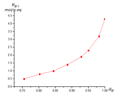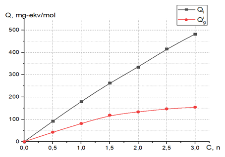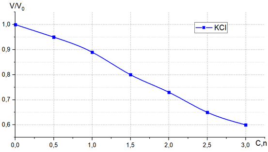 The obtained graphs show that the concentration of the KCl solution in equilibrium with the PVS gel increases the amount of sorbed electrolyte in the gel. This result can be explained by a decrease in the degree of gel saturation as the concentration of the equilibrium solution increases. In other words, as the gel absorbs the electrolyte, the process of desorption of solvent molecules in the polymer gel begins.