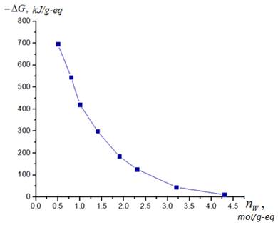 Figure 5. The dependence of the change in Gibbs free energy on the amount of adsorbed water during the PVS gelation process