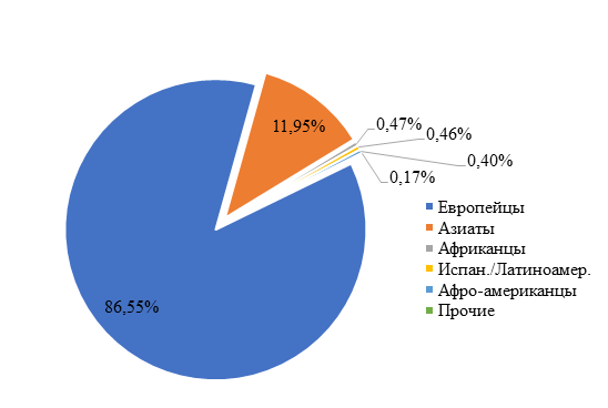 Рисунок 1. Сравнительное количество GWAS среди популяций. Распределение общего объема проведенных полногеномных исследований ассоциаций среди популяций мира (согласно базе GWAS Diversity Monitor, [31])
