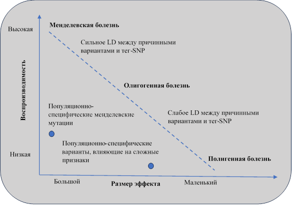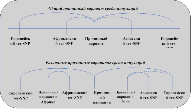 Разнообразие причинных мутаций может усложнять диагностику и лечение. Способность воспроизводить генетические ассоциации в различных популяциях может зависеть от нескольких факторов. Одним из них являются различия в неравновесном сцеплении между этническими группами, что влияет на то, насколько хорошо причинные варианты улавливаются тег-снипами (tagSNPs), идентифицированными в одной популяции (рис. 3). Маркеры, находящиеся в LD с вариантами риска у европейцев, могут не находиться в LD в других популяциях, поскольку паттерны LD отражают разные демографические истории, которые варьируются в глобальном масштабе.