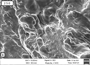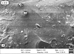 Figure 3a shows a 100x magnified image of the pores of the synthesized oleo gel with a new composition. Figure 3b shows a 250x magnified image of the oleo gel, revealing a close-up view of the arrangement of its macromolecules.
