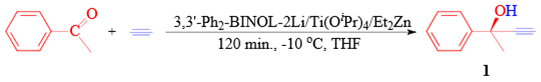 Synthesis of 2-Phenylbut-3-yn-2-ol using the 3,3'-Ph2BINOL-2Li/Ti(OiPr)4/Et2Zn Catalytic System. The reaction was carried out in a transparent, 2000 mL four-necked glass reactor equipped with a reflux condenser, dropping funnel, thermometer, and stirrer. Initially, at room temperature, a solution of 3,3ʹ-diphenylbinaphthol dilithium (3,3ʹ-Ph2BINOL-2Li) (127 mg, 0.2 mmol) in 1 mL tetrahydrofuran (THF) was mixed with titanium tetra-isopropoxide (Ti(OiPr)4) (426 μL, 1.5 mmol) and stirred for 15 minutes to prepare the catalytic system. To the reactor, a mixture of acetylene and diethylzinc (Et2Zn, 2 M in toluene) was added dropwise over 15 minutes while maintaining the temperature at -10 °C and stirring continuously. Then, a solution of acetophenone (120 mg, 1 mmol) was added to the reactor using a dropping funnel over 15 minutes at -10 °C, with constant stirring. The reactor temperature was controlled using liquid nitrogen. After all the components (substrate, reagent, catalyst, and solvent) were added, the mixture was stirred at -10 °C for 90 minutes.