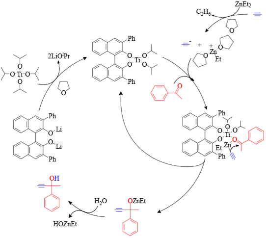 Initially, in the process, titanium tetra-isopropoxide (Ti(OiPr)4) and 3,3ʹ-Ph2BINOL-2Li interact in a tetrahydrofuran (THF) solution to form a stable catalytic component that retains its activity over time. During this interaction, two isopropoxide radicals from Ti(OiPr)4 react with two lithium atoms from 3,3ʹ-Ph2BINOL-2Li, producing two molecules of lithium isopropoxide and forming a catalytically active complex system consisting of 3,3ʹ-Ph2BINOL and Ti(OiPr)2. Under the influence of diethylzinc (Et2Zn), a π-complex initially forms with the acetylene molecule. The THF solvent solvates the carbocation from the diethylzinc molecule, facilitating the cleavage of the σ-bond between the sp-hybridized carbon and the mobile hydrogen in acetylene. This results in the formation of ethane in the system. The zinc ethyl carbocation reacts with the deprotonated acetylene anion to generate a zinc acetylide intermediate. This intermediate, under the catalytic influence of the complex system comprising 3,3ʹ-Ph2BINOL and Ti(OiPr)2, performs a nucleophilic attack on the carbonyl carbon of acetophenone, producing a highly modified intermediate component. Within the catalytic complex, the electron density of zinc shifts toward the highly electronegative oxygen atom, enhancing the concentration of acetylene anions in the system. This increase in anion concentration accelerates the reaction. In the final step, the π-bond of the carbonyl group in the substrate breaks, causing the sp²-hybridized carbon to transition to sp³ hybridization. A new C‒C bond forms, yielding the initial intermediate zinc ethyl alkoxide of 2-phenylbut-3-yn-2-ol, which subsequently undergoes hydrolysis to produce the final product, 2-phenylbut-3-yn-2-ol. It was determined that the greater the amount of the intermediate component formed, the higher the efficiency of product formation, directly contributing to the reaction's success [24].