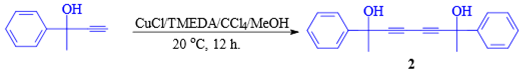 Synthesis of 2,7-diphenyloctadiyne-3,5-diol-2,7 in the CuCl/TMEDA/CCl4 catalytic system. In a thermally stable five-neck flask, an emulsion of 2-phenylbutyn-3-ol-2 and TMEDA was prepared in equimolar ratio for 60 minutes. Then, a suspension of 120 ml CuCl in methanol was added to this emulsion and mixed for 60 minutes. At a temperature of 20 °C, 2 moles of tetrachloromethane were added to the solution in the flask, which was stirred for 11 hours and allowed to stand for 24 hours. The solvent (MeOH) in the settled mixture was evaporated under ordinary conditions, and the organic and inorganic components were dissolved in 300 ml of water, which was then extracted with 300 ml of dichloromethane (3×200 ml). The organic layer was dried over Na2SO4. The solvent was evaporated under vacuum, and the remaining product was subjected to column chromatography on silica gel 60 using various eluents (CH2Cl2:MeOH 100:1, 30:1). As a result, 148 g of 2,7-diphenyloctadiyne-3,5-diol-2,7 (51%) was synthesized.