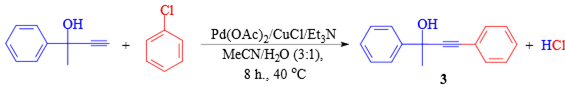 According to the results of the conducted research, the selected terminal acetylene alcohols were synthesized through the Sonogashira coupling reaction with chlorobenzene using the CuCl/Pd(OAc)2/Et3N catalytic system (in equimolar ratios of CuCl:Pd(OAc)2:Et3N) in an MeCN solution at 40 °C for 8 hours, yielding the highest amount of 2,4-diphenylbutyne-3-ol-2 (77%), which was chosen as the optimal condition for the process.