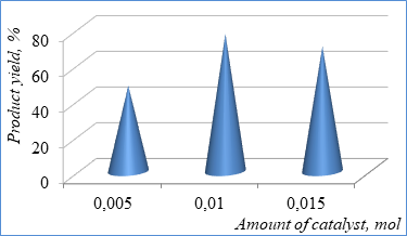 The effect of the selected catalyst amount on the yield of 2,4-diphenylbutyne-3-ol-2 was investigated (Figure 1). It was found that when 0.005 mol of the catalyst was used, the low yield of the product could be attributed to the limited formation of catalytic active centers and the high activation energy of the reaction. When 0.01 mol of the catalyst was used, the highest yield was achieved; however, further increasing the catalyst amount led to a decrease in reaction selectivity. It is noteworthy that increasing the catalyst amount resulted in additional reactions in the system, meaning that 2,4-diphenylbutyne-3-ol-2 interacted with excess catalysts to form alcohols, as well as converting into polymer products, as determined by the analysis results.