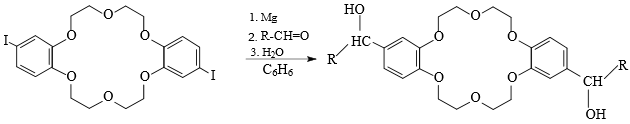При использовании реакции Гриньяра эти синтезы также проходят в 2 стадии: образование реактива Гриньяра из 4´,4´´-дийоддибензо-18-краун-6 и взаимодействие с альдегидами. Однако, выделять, очищать, охарактеризовывать и мн.др. реактив Гриньяра нет необходимости. И все 2 стадии реакции проводятся в 1 колбе (в одном реакторе), что значительно облегчает технику эксперимента и выходы вторичных спиртов дибензо-18-краун-6 составляют 84-92%.
