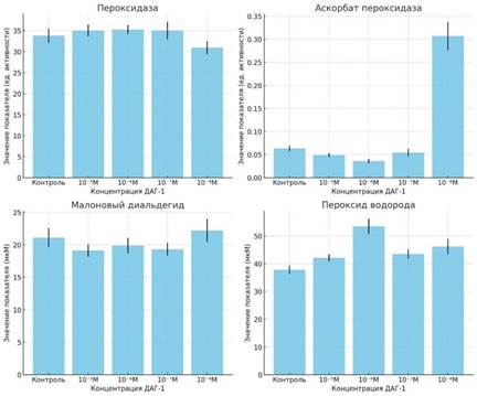 Полученные результаты показали, что различные концентрации ДАГ-1, за исключением концентрации 10⁻⁸ М, незначительно индуцировали активность ПО, но при этом активность была выше уровня контроля. ПО показала стабильную активность на средних уровнях концентрации ДАГ-1, что может указывать на достаточную антиоксидантную активность. Снижение активности при 10⁻⁸ М может свидетельствовать о недостаточной активации при низкой концентрации стимулятора. На ряду с ПО одним из основных ферментов антиоксидантной системы растения является АПО [7]. Изучение активности АПО в концентрациях до 10⁻⁷ М оказалась низкой, но резко возрастает при 10⁻⁸ М. АПО может активироваться в ответ на более низкий уровень ДАГ-1 (10⁻⁸ М), что отражает компенсаторный механизм для усиления антиоксидантной защиты (рис.1). Предполагается, что этот скачок активности может быть связан с окислительным стрессом при низкой стимуляции. Подобные феномены ранее были описаны в ряде работ. В частности, показано, что ПО и АПО проявляют различную чувствительность к уровням H₂O₂ и выполняют комплементарные функции в зависимости от характера и силы стресса [8]. В условиях умеренного стресса активируется, преимущественно, ПО, в то время как при более выраженном перекисном окислении, сопровождающемся накоплением H₂O₂ и МДА, активируется АПО как более чувствительный и специализированный фермент.