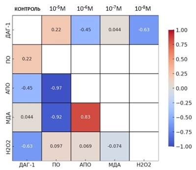 Уровень Н2О2 постепенно повышался с уменьшением концентрации от контрольной группы до 10⁻⁶ М, а затем снижался при 10⁻⁸ М. Результаты анализа показывают, что Н2О2, как маркер окислительного стресса, проявляет зависимость от концентрации ДАГ-1. Умеренные концентрации могут поддерживать высокий уровень перекиси, тогда как на самых низких концентрациях происходит его снижение, вероятно, за счет активации других антиоксидантных систем (например, АПО). Согласно стандартному анализу предельных значений, результаты показали значительные изменения при 10⁻⁵, 10⁻⁶ М и 10⁻⁸ М. МДА, как маркер перекисного окисления липидов, снижался на умеренных уровнях стимуляции ДАГ-1, что может указывать на защитный эффект. При этом в 10⁻⁵ - 10⁻7 М его количество снижалось, затем незначительно возрастало при 10⁻⁸ М. Легкий рост при 10⁻⁸ М может говорить о повышенном окислительном стрессе при низкой стимуляции, что требует дополнительных механизмов защиты. Из этого следует, что стабильная активность ПО и количество МДА при 10⁻⁵ - 10⁻7 М указывает на заметный эффект ДАГ-1 при этих уровнях. Скачок активности АПО при действии 10⁻⁸ М предполагает активный компенсаторный механизм при минимальной стимуляции. Концентрации 10⁻⁵ - 10⁻7 М могут быть оптимальны для поддержания баланса между антиоксидантной активностью и окислительным стрессом. Корреляционный анализ выявил зависимость между концентрациями стимулятора и показателями активности ферментов, уровнями МДА и Н2О2. (рис. 2).