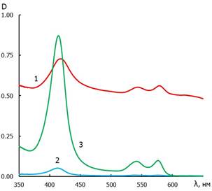 Рисунок 1. Спектры поглощения суспензии эритроцитов – 1; гемоглобина, контроль 1 (супернатант лизированных дистиллированной водой эритроцитов) – 2; гемоглобина, контроль 2 (супернатант нелизированных нативных эритроцитов) – 3