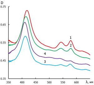 Как следует из представленных данных (рисунок 1, поз. 1), спектры поглощения суспензии эритроцитов характеризуются полосами светопоглощения с максимумами, характерными для оксигемоглобина: α-, β- и γ-полоса (или полоса Соре). Однако рассеивание света и «эффект сита» эритроцитарными клетками снижают выраженность этих экстремумов. Эффект «сита» сглаживает пики, а рассеяние света создает кажущееся поглощение образцом. И, хотя эти факторы усложняют анализ, собственно, спектров поглощения белков, и гемоглобина, в частности, тем не менее они могут быть использованы при оценке изменений положения максимумов поглощения в спектрах светопоглощения гемоглобина в составе эритроцитов.