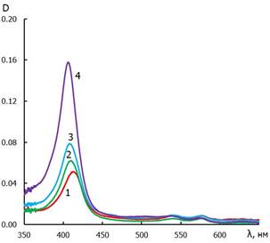 Электронные спектры поглощения регистрировали, используя UV/VIS спектрофотометр Shimadzu UV–2550PC (Shimadzu, Япония) со спектральным диапазоном 350–650 нм.