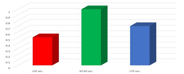 The hormonal response, particularly the secretion of testosterone, IGF-1, and growth hormone, should also be considered significant. According to the presented studies [17, 35], the duration of strength movements directly affects the intensity of anabolic hormone secretion, which in turn promotes the activation of protein synthesis and the proliferation of satellite cells. Research confirms that complex exercises performed with short rest periods (30–60 seconds) and moderate loads provide maximal hormonal stimulation [2, 7]. The analysis of studies shows that performing strength movements for 30–60 seconds most effectively combines the necessary stimuli (mechanical tension and metabolic stress) required for achieving muscle hypertrophy. For example, Schoenfeld et al. [27, 28, 29] demonstrated in several studies that exercises with a moderate number of repetitions (6–12) and a total set duration of 30–60 seconds lead to maximal hypertrophy. Schoenfeld notes that excessively long sets (>70 seconds) reduce working weights, negatively affecting mechanical tension. Burd et al. [5] mention that slow-tempo strength movements increase metabolic stress; however, excessively prolonged duration (>70 seconds) reduces overall intensity, limiting hypertrophy. Lasevicius et al. [18, 19] compared traditional sets (6–12 repetitions) and slow sets (3–5 repetitions with a prolonged eccentric phase) and found that increasing set duration without increasing working load may be ineffective. Campos et al. [6] examined the effects of low (3–5), moderate (9–11), and high (20–28) repetition ranges on hypertrophy and determined that muscle mass increases most with a moderate number of repetitions. Tanimoto and Ishii [32] showed that a slow tempo (4-0-4) activates more muscle fibers but reduces overall working load. The meta-analysis by Wernbom et al. [34] revealed that the optimal repetition range for hypertrophy is 6–12, and the duration of strength movements should be 30–60 seconds. Henselmans and Schoenfeld [16] confirmed that eccentric loading (prolonged descending phase) is more effective for muscle growth during strength movements. Dankel et al. [10, 11] determined that the total duration of strength movements is a more important factor than the specific number of repetitions per set. Other authors also confirm that performing strength movements with a moderate number of repetitions and moderate intensity is the most effective approach for muscle growth. The meta-analysis by Grgic et al. [28] shows that moderate weights and medium-duration sets have the most positive effect on hypertrophy. Phillips et al. [35] studied the impact of various strength movement durations on protein synthesis and determined that the strongest effect is achieved with strength movements lasting 30–60 seconds. Schoenfeld and Grgic [28] confirmed that medium-duration sets (30–60 seconds) are the most effective for muscle growth. The effect of resistance movement duration on hypertrophy is shown in detail in Figure 2.