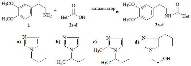 Были также проведены реакции гомовератриламина с некоторыми α-аминокислотами (глицин, лейцин, изолейцин). В этих реакциях особое внимание уделяется биполярной природе аминокислот и их оптической активности [18]. Однако относительно высокие температуры (до 180°С) в условиях проведения реакций потребовали решения таких задач, как образование полипептидов путем сшивания аминокислот. Аминогруппа защищена защитными группами, такими как бензил и фталил, для предотвращения образования дикетопиперазинов α-аминокислотами при нагревании [19]. Таким образом, хотя существует несколько традиционных методов синтеза амидов, конкретные подходы в зависимости от структуры кислоты влияют на выход продукта. Целью данного исследования является изучение реакций каталитического амидирования имидазолсодержащий гетероциклических кислот.