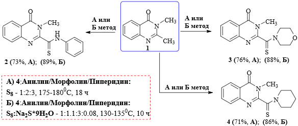 Для продолжения этих работ были проведены реакции многокомпонентного тиоамидирования в различных условиях в соединениях, содержащих две метильные группы. В наших исследованиях многокомпонентное тиоамидирование содержащих в молекуле диметил-группы с участием метильных групп 2,3-диметилхиназолин-4-она (1) и является определяющим фактором, влияющим на проведение и ход реакций. Для этого были проведены реакции тиоамидирования 2,3-диметилхиназолин-4-она (1) с участием анилина, морфолина и пиперидина по методам А и Б.