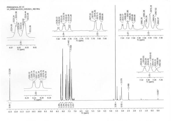 В спектре ЯМР 1Н анилида 3-метилхиназолон-4-ил-2-тиокарбоновой кислоты (2) экзоциклическая NH-группа находится при 12,5 м.е. (1H, с), 4 ароматических протона хиназолонового фрагмента: 8,2 м.е. (1H, ддд, H-5), 8,04 м.е. (2Н, дд, Н-6,8), 7,8 е.е. Внешний вид в сферах (1H, дт, H-7), ароматические протоны фенильного фрагмента: 7,68 м.е. (1Н, дд, N-2'), 7,52 (1Н, дт, N-6'), 7,44 (2Н, т, Н-3',5') и 7,29 (1Н, тт, Н-4') обнаружение, сигнал метильной группы N-CH3 при 3,7 м.е. его появление в поле в виде трехпротонного синглета (3Н,s) доказывает его структуру (рисунок 2).