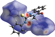 Кристаллическая структура анилида 3-метилхиназолон-4-ил-2-тиокарбоновой кислоты (2) и результаты анализа поверхности Хиршфельда представлены на рисунках 2 и 3. Вещество кристаллизуется в моноклинной пространственной группе Р21/n, а асимметричная ячейка состоит из двух молекул одинаковой конформации, отличающихся ориентацией фенильной группы относительно остальной части молекулы. В кристалле две межмолекулярные водородные связи N–H⋯N приводят к образованию димера (рисунок 3):