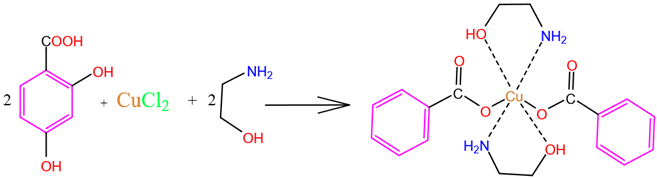 The synthesis of the first ligand complex was carried out as follows: Copper (II) chloride (CuCl2), weighing 0.0136 g, was dissolved in 2 ml of ethanol at 50°C under ultrasonic treatment in a water bath until fully dissolved. Subsequently, 0.0308 g of 2,4-dihydroxybenzoic acid (2,4-DHBA) and monoethanolamine (MEA) dissolved in 2 ml of ethanol were added dropwise to the solution. Upon addition, the solution color gradually changed from light green to brown. The synthesis proceeded according to the following scheme.