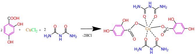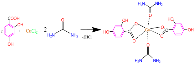 The synthesis of the complex was carried out under precisely controlled reaction conditions to optimize pH and reaction time for the formation of the Cu (II) complex with 2,4-dihydroxybenzoic acid and urea. Copper (II) chloride (CuCl₂), weighing 0.0136 g, was dissolved in 2 ml of ethanol at 40°C using ultrasonic treatment in a water bath until fully dissolved. Then, 0.0308 g of 2,4-DHBA (L1) and 0.006 g of urea (L3), dissolved in 2 ml of ethanol, were added dropwise to the solution. Upon addition, the solution color changed to light green. The synthesis proceeded according to the following scheme: