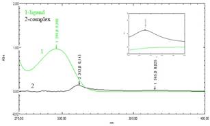 According to the UV-Vis spectral analysis, the ligand exhibited an absorption maximum at λmax=296 nm, whereas the complex showed a bathochromic shift with λmax=312 nm. This shift is theoretically attributed to π→π∗ electronic transitions. Additionally, a hypochromic effect was observed, characterized by a decrease in the molar absorptivity coefficient from ε=0.968 for the free ligand to ε=0.145 in the complex, likely due to changes in the refractive index of the solution.